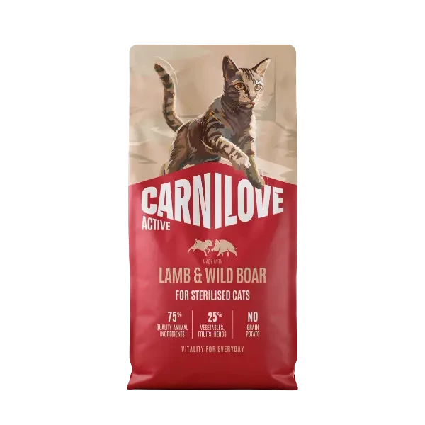 Carnilove Active Lamb & Wild Boar Sterilised Cats is een graanvrije, complete droogvoeding speciaal ontwikkeld voor actieve gesteriliseerde katten. De combinatie van lam en wild zwijn levert hoogwaardige dierlijke eiwitten en sluit aan bij de natuurlijke behoefte van de kat. Er is gekozen voor een combinatie van vers vlees en eiwitten. Dit zorgt er voor dat het totale eiwitgehalte hoger uitvalt dan als je alleen met vers vlees werkt.